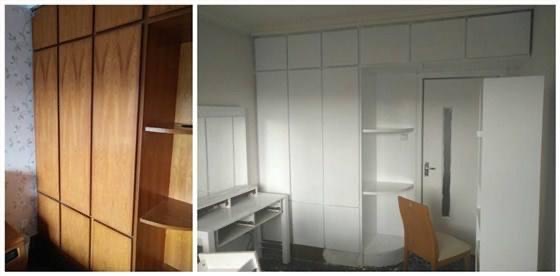 改色翻新:衣柜颜色看得太久,想换个颜色。这个过程就比较复杂了,要经过去油污、刮油性腻子、砂纸打磨、涂油色、刷清漆等等。