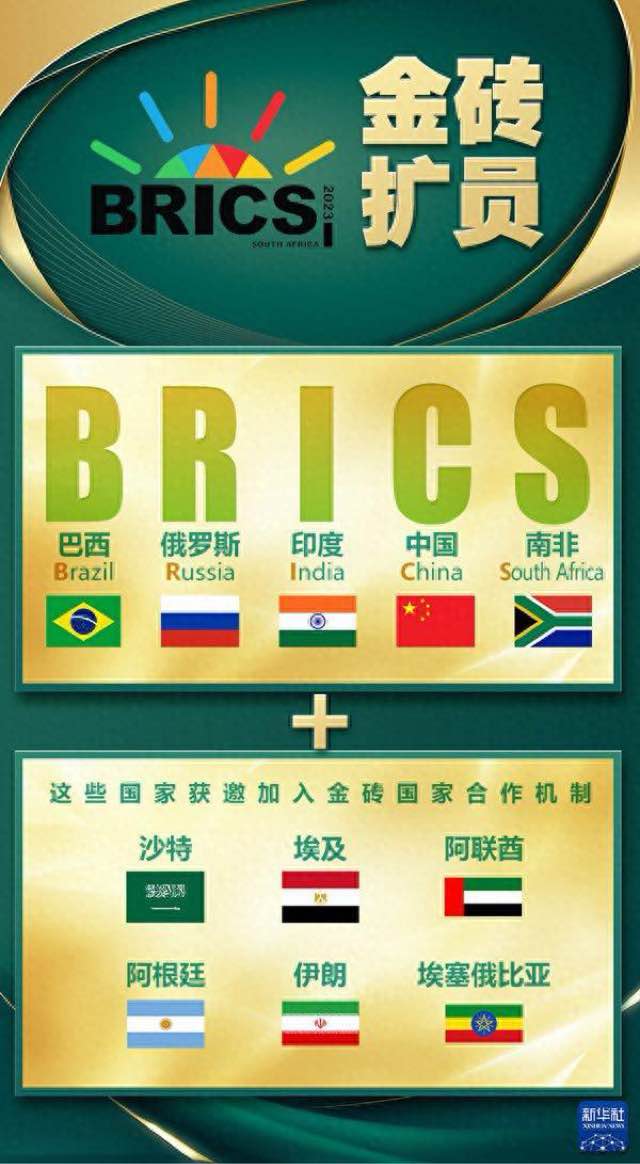 会议宣布,邀请沙特、埃及、阿联酋、阿根廷、伊朗、埃塞俄比亚正式成为金砖大家庭成员,成员身份将于2024年1月1日生效。