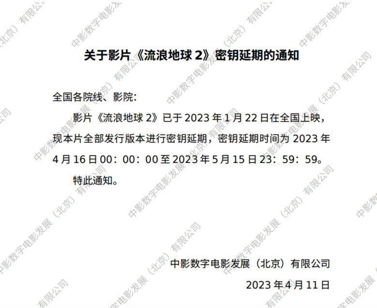 近日,中影发布通知称电影《流浪地球2》密钥再次延期,将延长上映至5月15日。