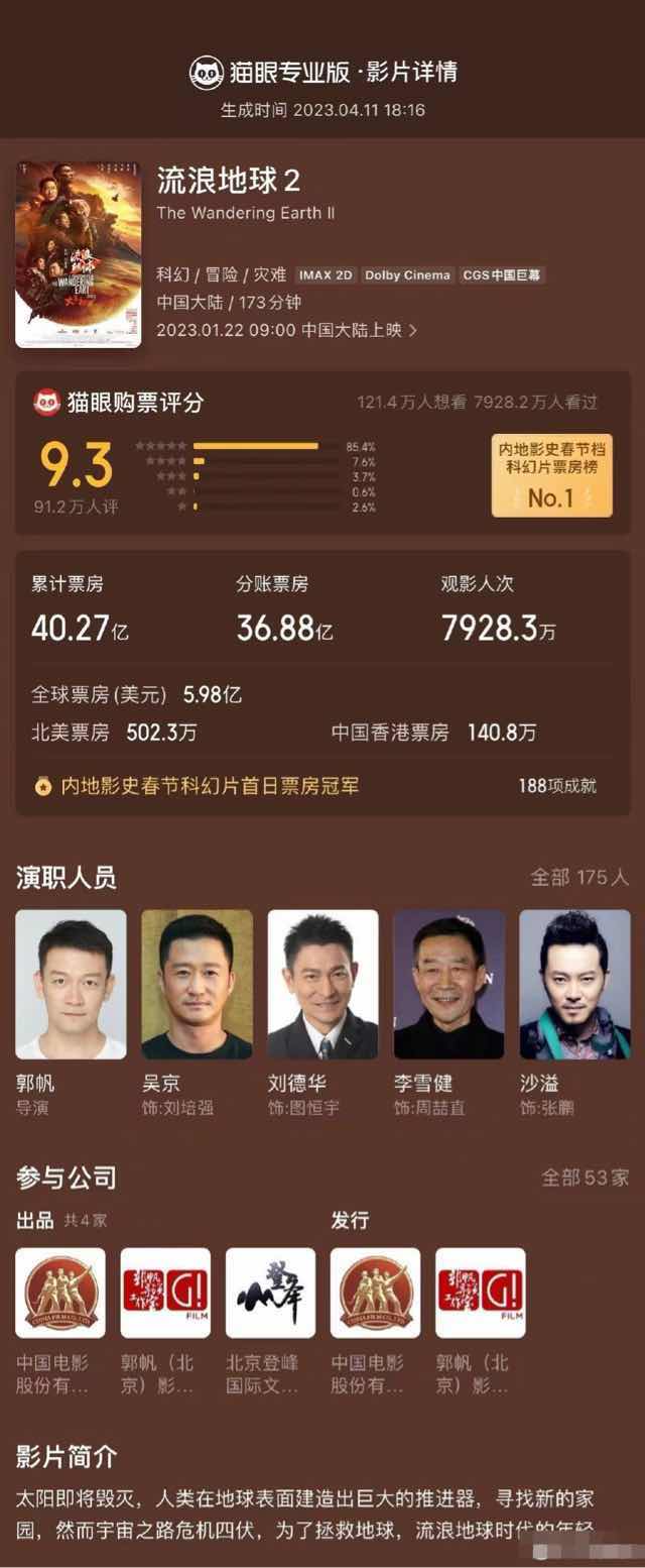 近日,中影发布通知称电影《流浪地球2》密钥再次延期,将延长上映至5月15日。据猫眼专业版数据,截止当前累计票房已达40.27亿。