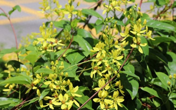 星果藤又叫做三星果,它是一种开花植物,开花的时候是黄颜色,开花性能非常的强,小齐养了一棵养了两年的时间,逐渐摸索出它的养护习性,如果你想养的话一定要选择一下,它的长势非常的快速,一棵小苗一年就能够爬满两米高的花架,当做花墙去栽培也是非常合适的,但是他怕低温,要保证冬季温度在五度以上,而且要有一个光照充足的环境。再去水肥跟上,它就会快速的生长,它开花性能非常的强,主要的花期是在春秋两季,夏季高温,如果缺光它是不开花的。冬季温度低于十度会停止生长,所以如果你想养,保证合适的温度,给它水肥跟上,光照充足,它就能够一直长一直开。开花的时候成片开,黄灿灿的花挂在上面非常的美。