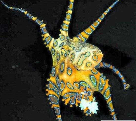 5、蓝环章鱼蓝环章鱼是海洋中最具攻击性的动物之一,它们以身上蓝色的圆滑而得名,如果碰到猎物或者是敌人,他们就会提高警惕。一旦被靠近,他们就会释放毒液,并且这种毒液的毒性极强,分分钟致人死亡,并且目前还没有找到解毒的方法。