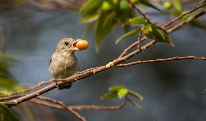 嘴里叼着水果的淡嘴啄花鸟