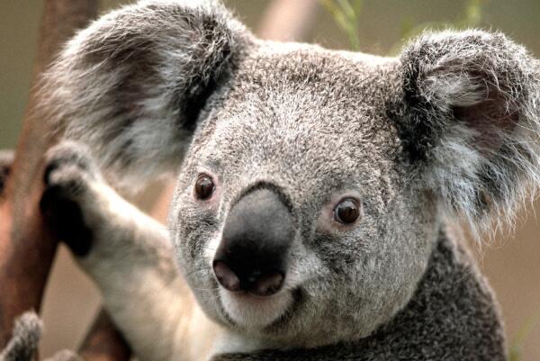 【考拉】考拉长相酷似小熊,看起来很憨厚,它有一对大耳朵,鼻子裸露且扁平,尾巴退化成一个“座垫”,使它可以长时间坐在树上,平衡感极强。