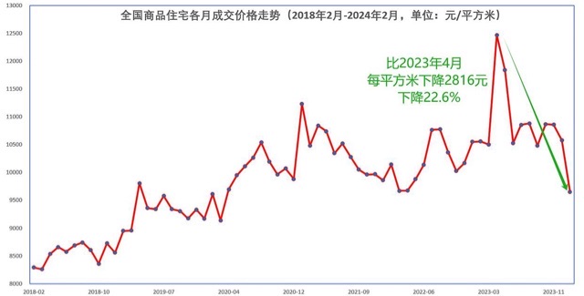 今年前两个月,全国新建住宅销售额和销售面积分别是9227亿元和9559万平方米,能计算出平均成交价格是9653元/平方米。这一价格与2023年4月顶峰的12469元/平方米相比,每平方米下降2816元,下降22.6%。