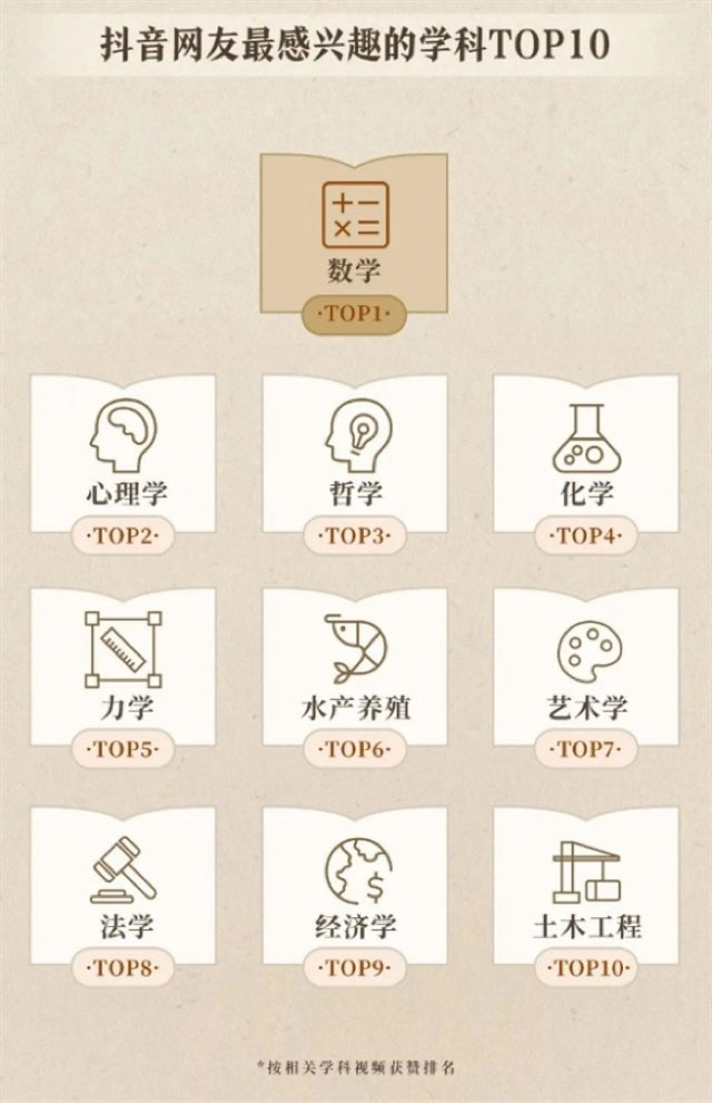 今天《2023抖音公开课学习数据报告》公布,报告回顾了过去一年,抖音上高校公开课的学习数据。抖音网友最喜欢的学科前十位中,堪称学习难度最高的数学居然排名第一。最“神秘”的心理学和哲学分列二三名。第四、第五给到了化学和力学。【足记网】冷门的水产养殖居然排名第六。