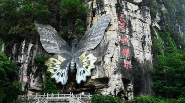 蝴蝶泉是一个集奇山、秀水、幽洞、田园风光为一体的旅游景区,位于桂林阳朔月亮山风景区“十里画廊”的精华地段,有“不到蝶山顶,不知阳朔景”之美誉。 蝴蝶泉因蝶洞内有一股泉水从山腰悬崖涌出而得名。是中国最大的活蝴蝶观赏园,有上千种、数万只蝴蝶与人和谐相处。蝴蝶泉还是鸟瞰阳朔“香格里拉”遇龙河和羊角山等精华田园风光的最佳观赏台。