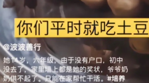 有一对姐弟,家里贫困,每天都会上山砍柴,每天吃的只有土豆,因为土豆是最容易得到的食物,家里只有土豆。云南波波这位慈善大侠,超人似的存在,他来了,带着大爱无疆,视频煽情,姐弟俩好可怜,看得网友都挥泪,按捺不住要捐款,自然是需要通过云南波波转交,不急,先看云南波波的表演。